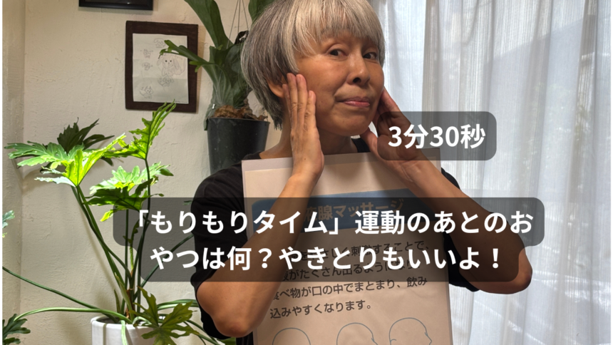 フレイルトレーナーの モーリンです。 金曜日は、 「栄養とお口のトレーニングの日」 「もりもりタイム」運動のあとのおやつは何?をお送りいたします。 みなさん、焼き鳥はお好きですか? 私は大好きですが、どうも夕飯としか思っておりませんでした。 ところが、きんちゃんアドバイス♡ 運動のあとの、おやつとしても良いですよ♡ やはりたんぱく質をしっかり食べることができます。 こんなおやつもありなので、 おいしく召し上がってくださいね。 口トレは、唾液腺マッサージです。 唾液でうるおうお口の中は、 オーラルフレイル予防にはとっても大切! 生活の中に、ぜひ取り入れてみてくださいね。 それでは、どうぞ~。
